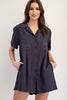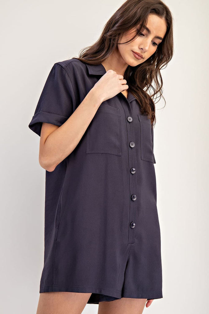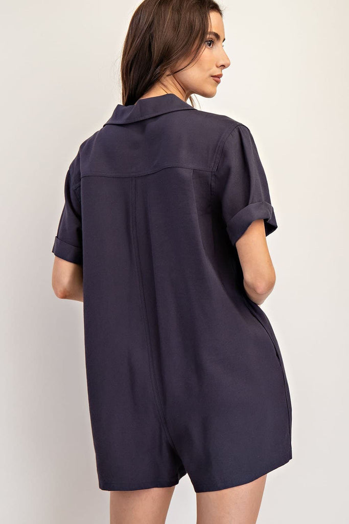 This short sleeve romper features a button front closure, a collared neckline, rolled cuffs, two chest patch pockets, two side hip pockets, and a relaxed fit, offering both functionality and a polished, casual vibe.