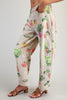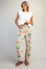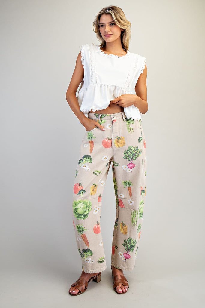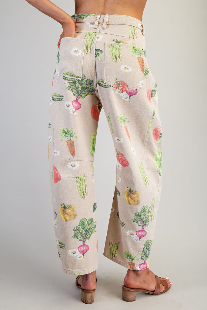 These mineral washed pants feature an allover garden vegetable and floral print on a neutral woven base, designed with a high rise waist, belt loops with double back buckle accents, side hip pockets, back patch pockets, seamed panel detailing down the legs, and a relaxed barrel leg silhouette for a playful yet structured look.
