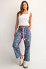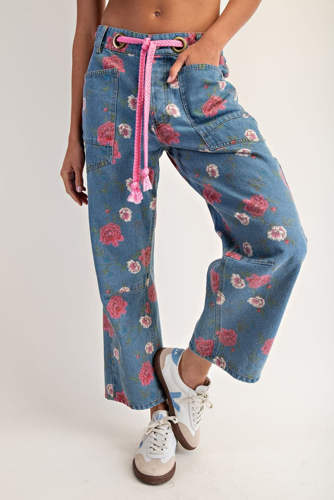 These floral denim pants showcase an allover rose print, oversized patch pockets, back patch pockets, a barrel leg silhouette, and a playful contrast rope drawstring threaded through grommets for a bold blend of utility and femininity.