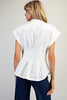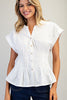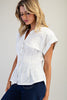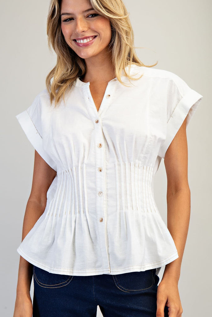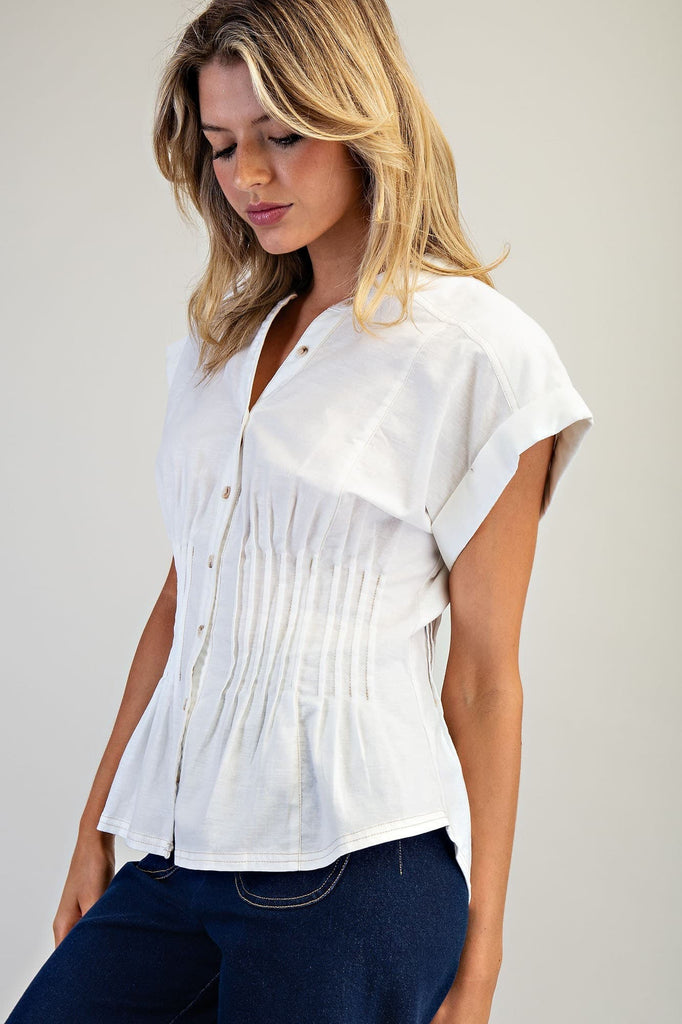 This soft washed button front top features a round neckline, wide cuffed cap sleeves, and a series of vertical pintuck pleats that draw in the waist before releasing into soft gathers at the hem for a gently shaped, feminine silhouette.