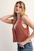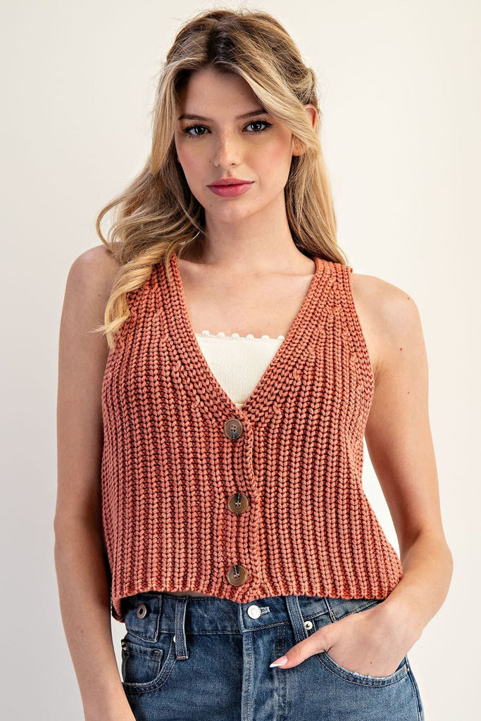This knit vest showcases a cozy textured design, a deep V-neckline, three-button front closure, and a relaxed cropped silhouette, offering a stylish yet effortlessly casual layering piece for any season.