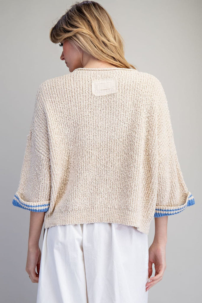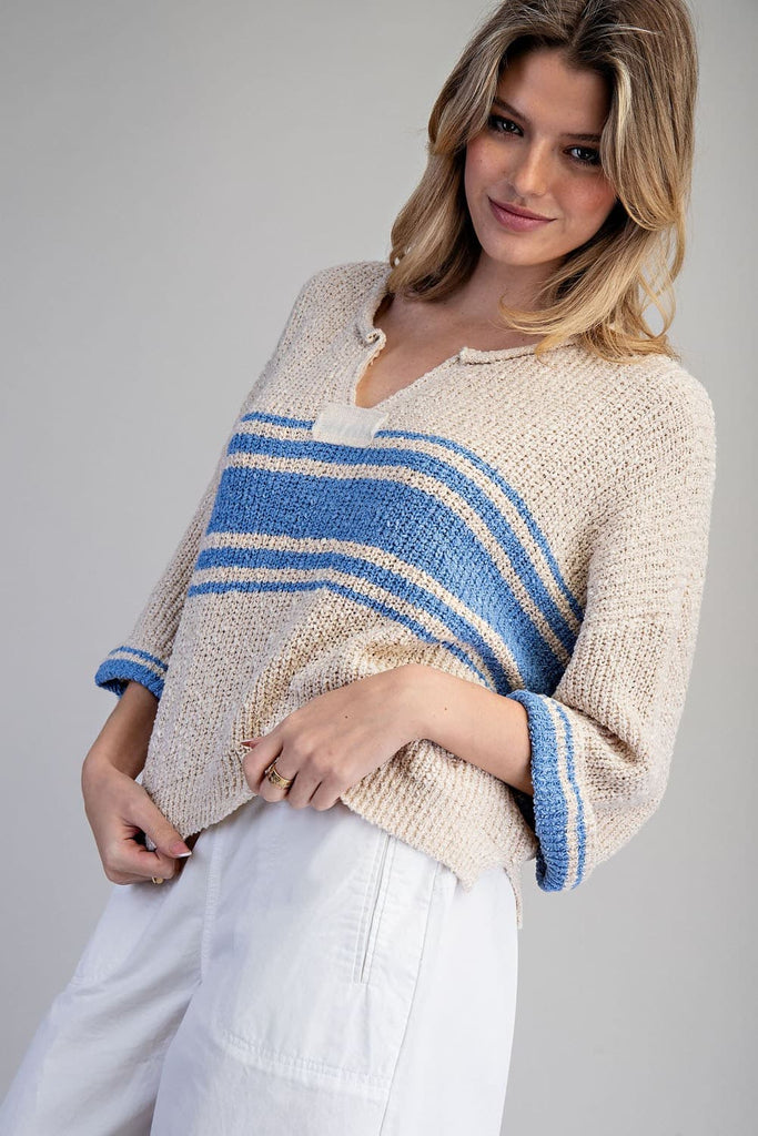 This textured knit sweater features a relaxed cropped boxy silhouette, a subtle notched neckline, wide elbow length sleeves with contrast trim, bold horizontal stripe detailing across the body, side hem slits, and an easy, laid back feel.