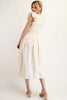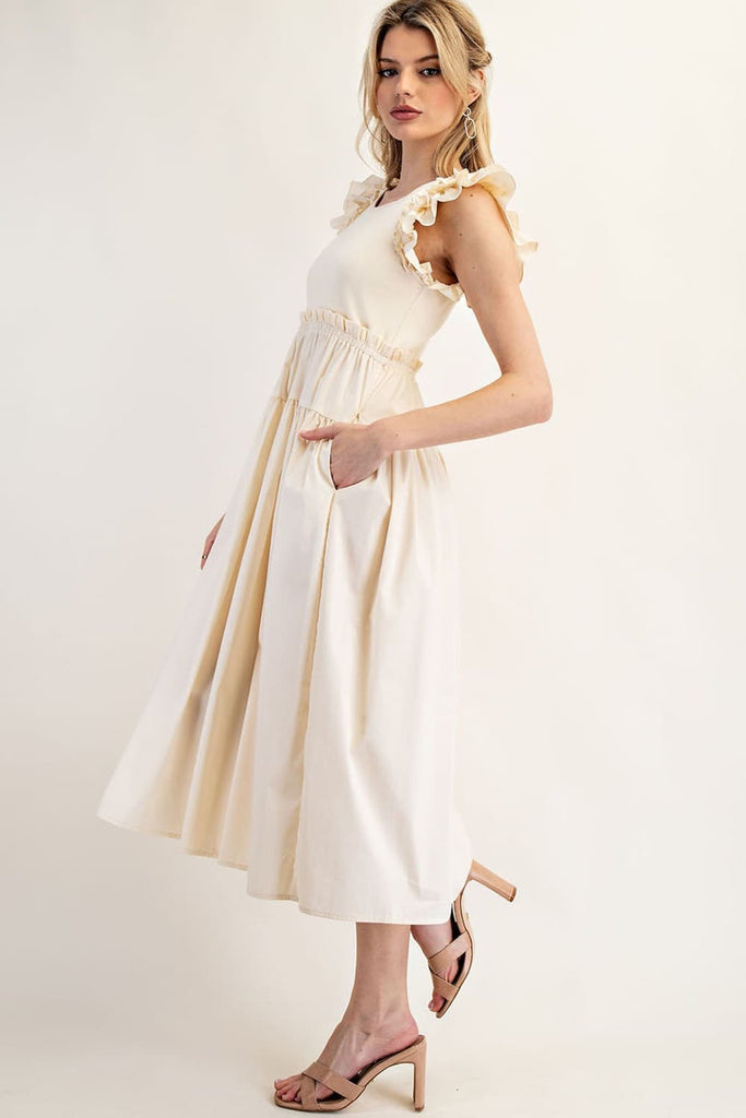 This midi dress showcases a fitted and ribbed bodice with delicately ruffled shoulder details, a rounded neckline, and a cinched waist that flows into a voluminous gathered skirt with hidden side pockets for an effortlessly romantic yet functional silhouette.