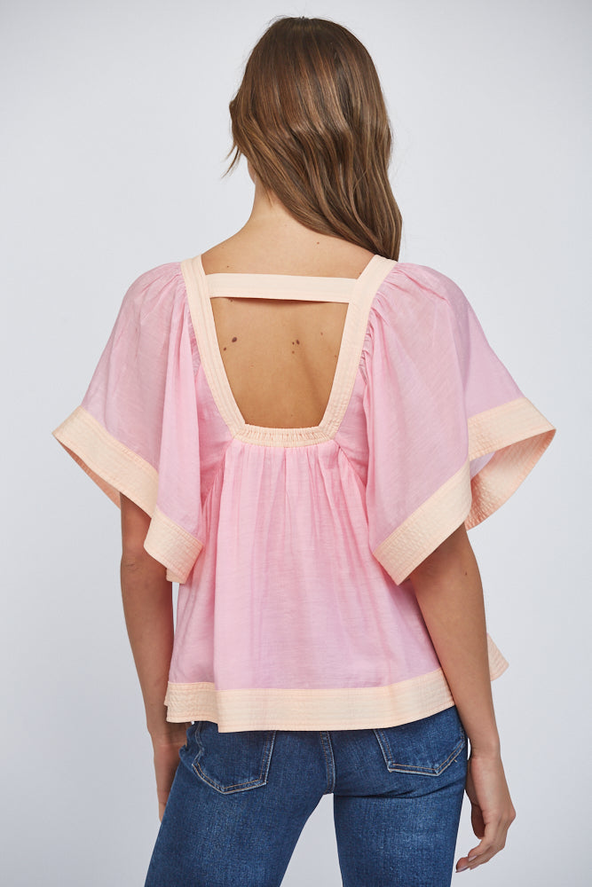 This airy flutter-sleeve top brings a romantic, effortless feel to your everyday style. Designed with a soft ombre wash and a flattering V-neckline, it drapes loosely for an easy, comfortable fit. The flowy sleeves add movement and softness, while the open back detail gives it a subtle, unexpected touch. Perfect for pairing with denim when you want something light, feminine, and easy without feeling overdone.