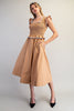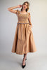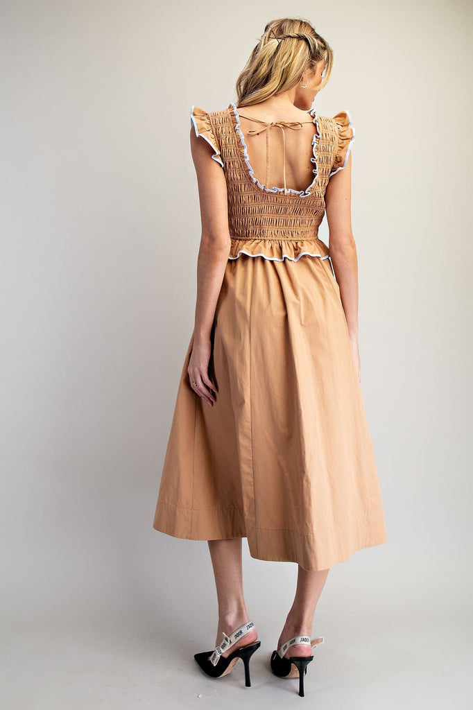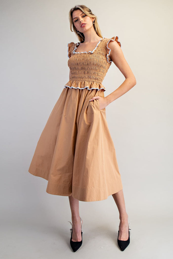This dress features a smocked bodice with contrast edged ruffled straps and a matching ruffled peplum detail, paired with a flowy A-line midi skirt and side pockets for a sweet, feminine finish.